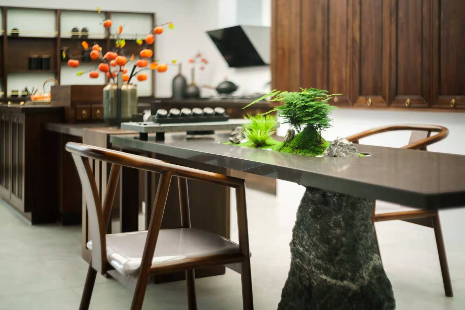中式的大理石长台,精致的假山盆景,远处掩映着方太灶具区。茶具辗转间,观众仿佛置身于精致静谧的书房,细看才知晓,这是方太给观众带来的中式开放式厨房的新方向和新未来。