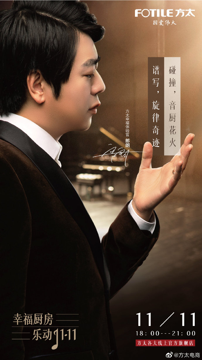郎朗是一位非常出色且很有亲和力的艺术家,人们不仅能听到他技艺高超的钢琴演奏,也经常感受到他和吉娜的幸福家庭,这一点与方太不谋而合,方太在始终传递家庭幸福之道。本次双11郎朗与方太合作的主题即为#幸福厨房、乐动11.11#。